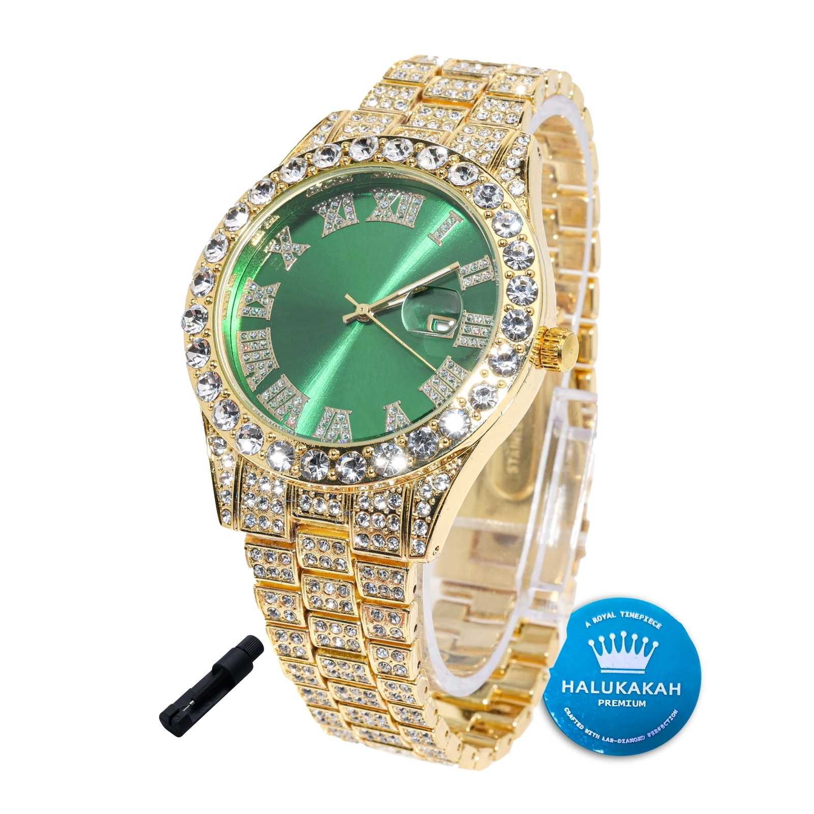 DAZZLING DIAMONDS: Adorned with VVS Clarity Prong Set Austrian Simulate Diamonds, meticulously handset to create a signature micro-pave style, ensuring brilliance and sophistication. LUXURY MATERIALS: Utilizing 3D Electroforming Technology, the watch features a thick 18k real gold plating, enriching its color and providing a luxurious finish.